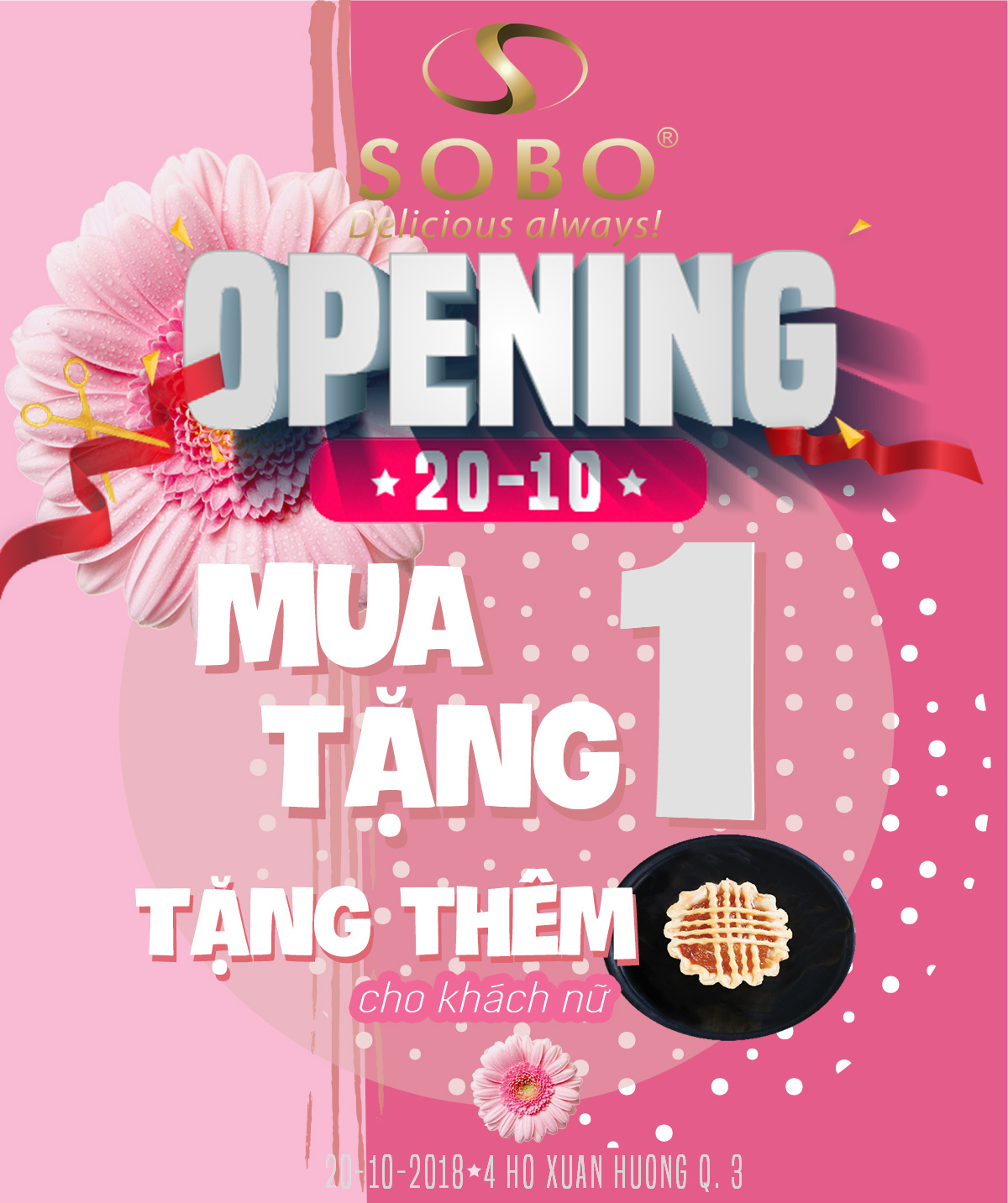 Mừng khai trương, SOBO đem đến chương trình Mua 1 Tặng 1 áp dụng cho tất cả khách hàng khi đến dùng bữa tại nhà hàng SOBO.